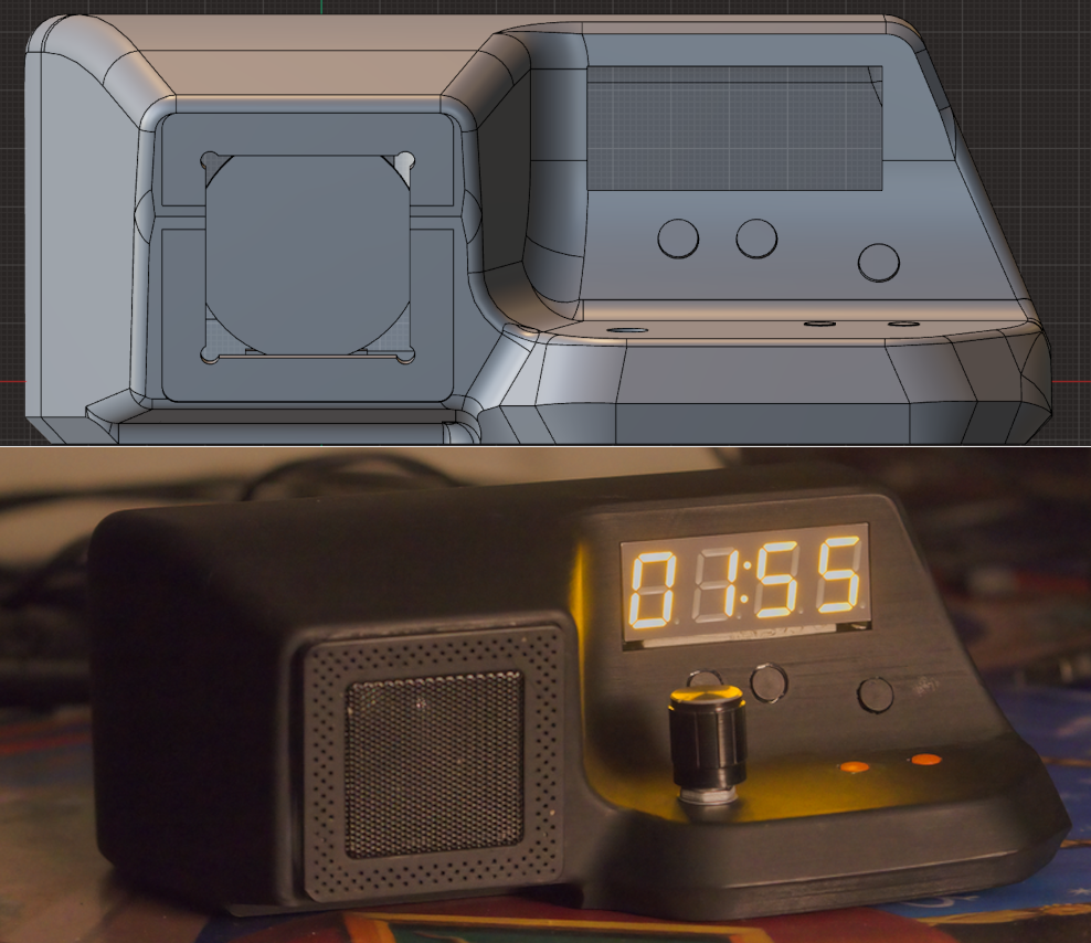 An alarm clock I made for a friend with a 3D printed enclosure that I designed. Shown here in both the design phase and in the final form.