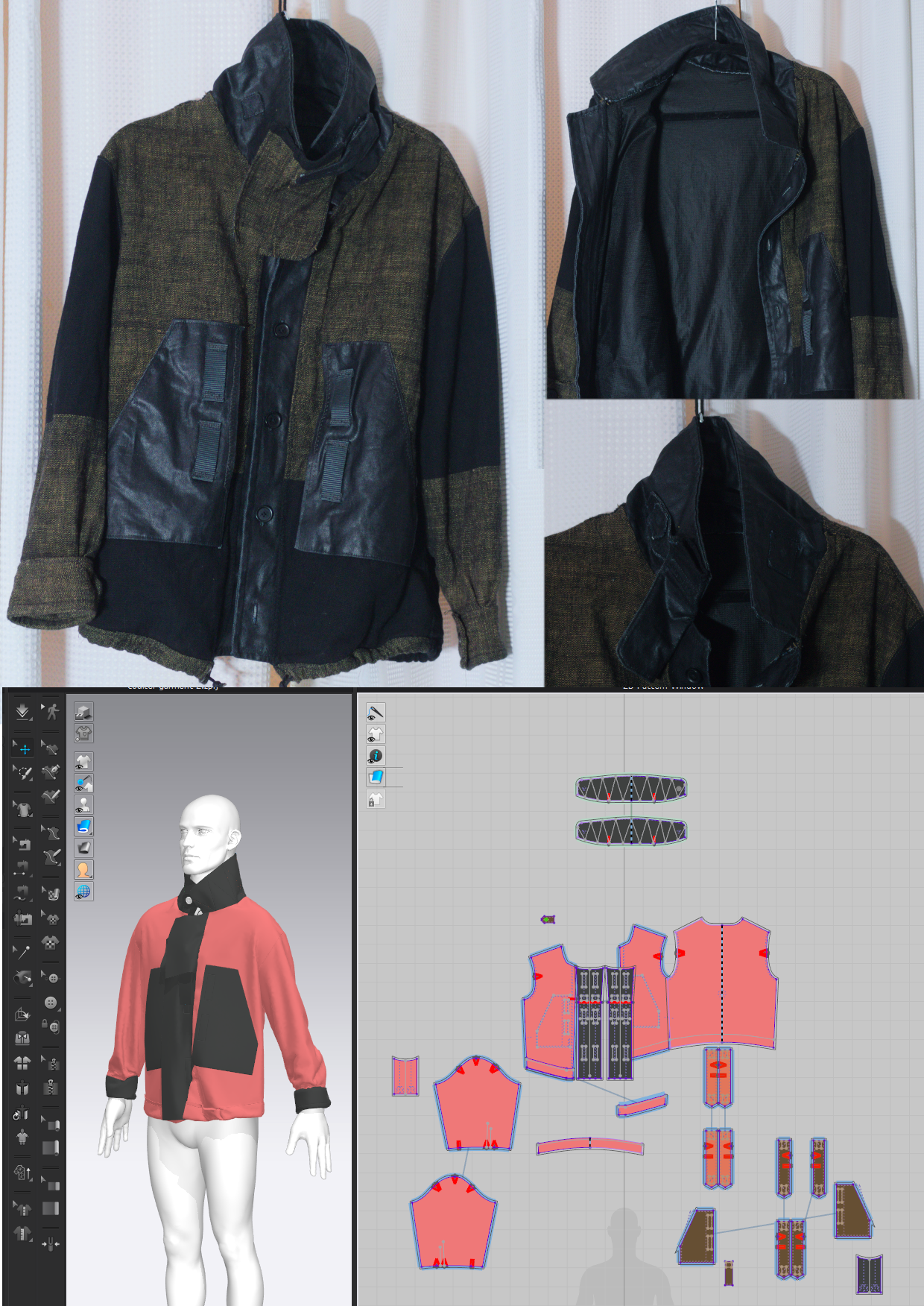A light jacket that I made seen above fully constructed, and below in the textile simulation and pattern making software Clo3D.